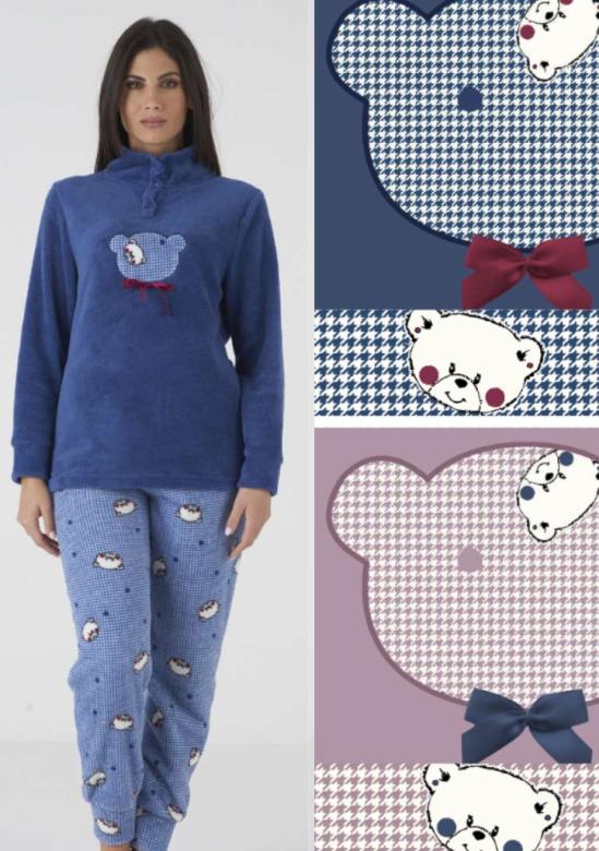 dámské pyžamo od italské značky Karelpiu. Měkké, jemné a hřejivé pyžámko je z velmi příjemného materiálu. Vrchní díl má stojáček a zapínání u krku na tři knoflíky. Rukávy jsou ukončeny jemným úpletem. kalhoty mají v pase všitou pohodlnou gumu.