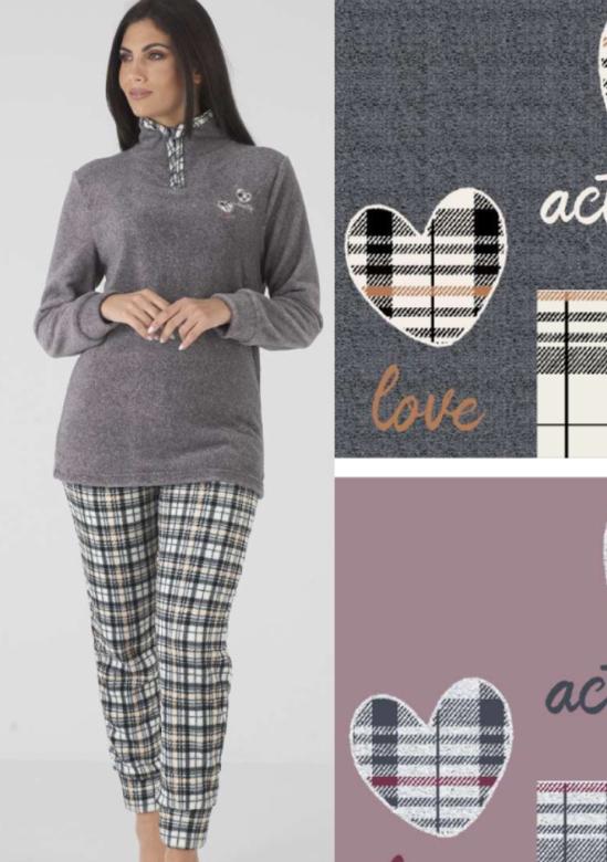 Dámské pyžamo od italské značky Karelpiu. Měkké, jemné a hřejivé pyžámko je z velmi příjemného materiálu. Vrchní díl má stojáček a zapínání u krku za zip. Rukávy jsou ukončeny jemným úpletem. Kalhoty mají v pase všitou pohodlnou gumu.