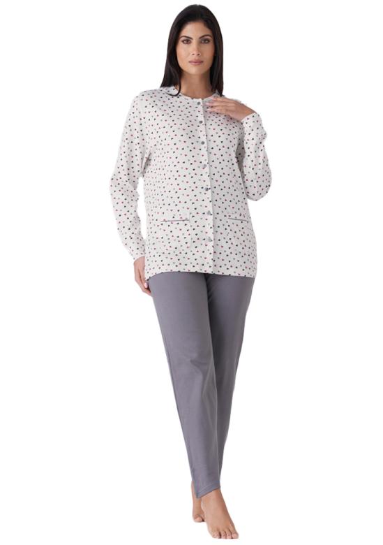 dámské bavlněné pyžamo značky Karelpiu. Pyžamo se skládá z kabátku s dlouhým rukávem, je celopropínací na knoflíky. Rukávy jsou ukončené volně. kalhoty jsou v pase do pružné obšité gumy. Pyžamo je ušité z příjemné hřejivé bavlny. Materiálové složení: 100% bavlna