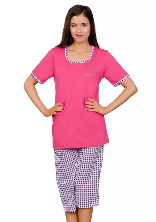 dámské pyžamo Majka 683/4 TARO je ideální volbou pro pohodlné večery i domácí chvíle oddechu. Tričko v krásné růžové barvě zdobí jemný kostkovaný lem kolem výstřihu a rukávů, což dodává celému modelu svěží a moderní vzhled. Capri kalhoty s nevtíravým kostkovaným vzorem jsou šité bez kapes a mají volnější gumu v pase pro maximální komfort.Toto pyžamo je vyrobeno ze 100% bavlny, díky čemuž je velmi příjemné na pokožce, prodyšné a vhodné i pro citlivou pleť. Bavlněný materiál zajišťuje skvělou odolnost a sn…
