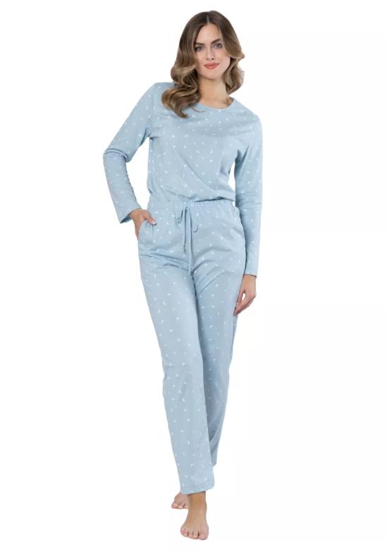 Dámské pyžamo Marta 1646 značky LEVEZA v jemné světle modré barvě s drobným vzorem je ideální volbou pro pohodlné i stylové večery. Design s dlouhými rukávy a kulatým výstřihem zajišťuje komfort a komfortní pohyb. Elastický pas s nastavitelnou šňůrkou na spodních kalhotách přispívá k perfektnímu přizpůsobení na míru.