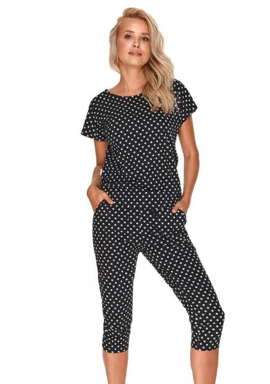 dámské pyžamo Natasha 2668/2 TARO představuje pohodlný a stylový kousek pro vaše domácí chvíle nebo večerní odpočinek. Pyžamo je ušito z 100% kvalitní bavlny, což zaručuje příjemný pocit na pokožce a dostatečnou prodyšnost během celého dne. Model má krátké rukávy a capri kalhoty se vzorem drobných puntíků, které dodávají oděvu hravý a zároveň moderní vzhled.