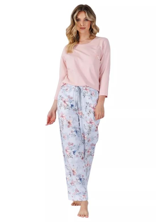 Dámské pyžamo Roza 1522 LEVEZA představuje ideální volbu pro pohodlné večery i klidný spánek. Pyžamo má kulatý výstřih a dlouhý rukáv, což zajišťuje příjemný pocit během chladnějších nocí. Malá kapsa na prsou je ozdobena jemnou mašličkou, která dodává celku něžný detail.Vrchní část je vyrobena z měkkého a prodyšného bavlněného úpletu, který je šetrný k pokožce. Dlouhé vzorované kalhoty jsou bez kapes a disponují praktickou šňůrkou ke stažení v pase pro lepší přizpůsobení.Celkově je tento model zhotoven z…