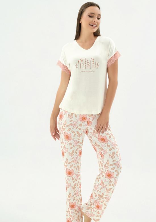 Dámské pyžamo s krátkým rukávem spojuje pohodlí s jemnými ženskými detaily. Tričko je doplněno rukávy zakončenými krajkou, která dodává celému modelu elegantní a romantický vzhled. Přední stranu zdobí stylová aplikace, jež podtrhuje celkový design.