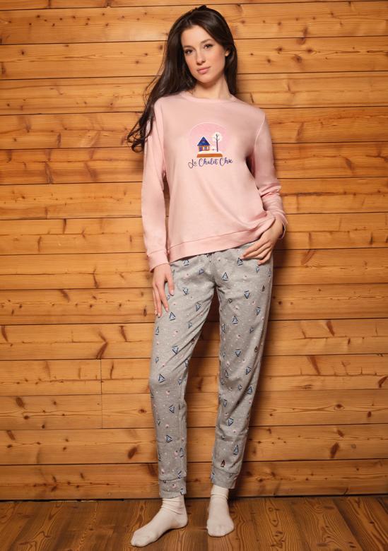 Roztomilé dámské pyžamo Siélei s motivem horské chaloupky a nápisem Le Chalet Chic přináší dokonalou kombinaci pohodlí a stylu. Horní díl v jemně růžové barvě má kulatý výstřih a dlouhé rukávy, příjemně hřeje a je ideální na chladnější večery. Kalhoty jsou šedé s drobným potiskem, mají elastický pas a volný střih pro maximální komfort při spánku. Pyžamo je vyrobeno z měkké, prodyšné bavlny a je baleno v elegantní dárkové krabičce.