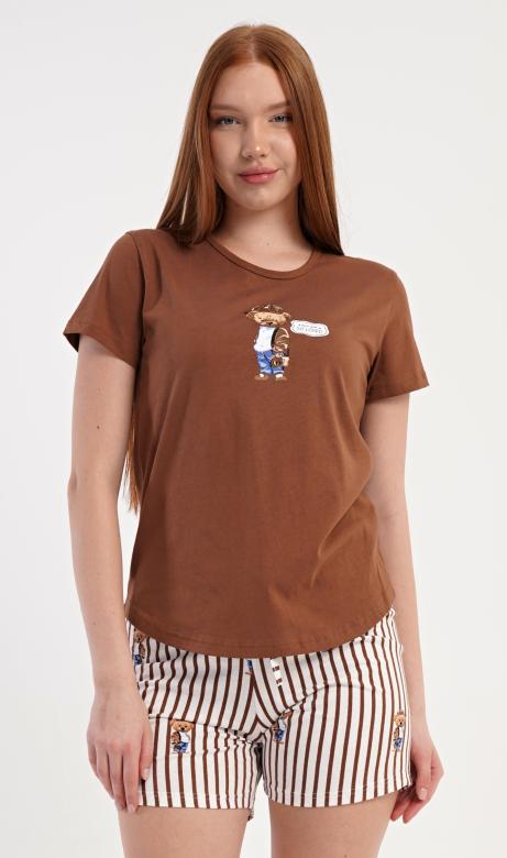 Dámské pyžamo se skládá z trička s krátkým rukávem a šortkových kalhot. Jednobarevné tričko zdobí obrázek medvídka.