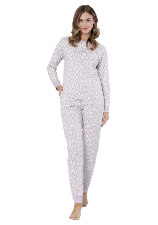 Dámské pyžamo Zoja 1615 značky LEVEZA představuje ideální spojení pohodlí a stylu pro každou ženu, která si chce užít klidné chvíle doma. Jemný levandulový odstín s moderním vzorem dodává tomuto pyžamu něžnost a osobitost. Vrchní část nabízí dlouhé rukávy s kulatým výstřihem, který je zdokonalený o elastické manžety na zápěstích, což zaručuje pohodlné nošení bez omezení.