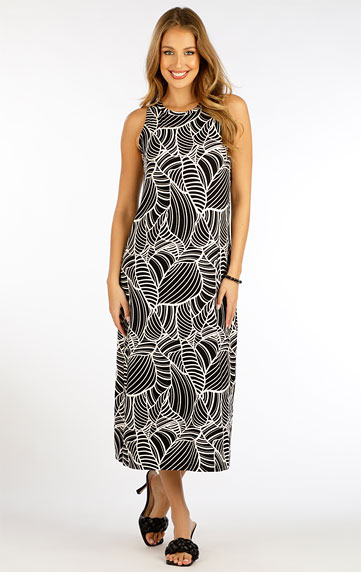 Dámské šaty mají jednoduchý střih s vykrojenými průramky a kulatým výstřihem v maxi délce.