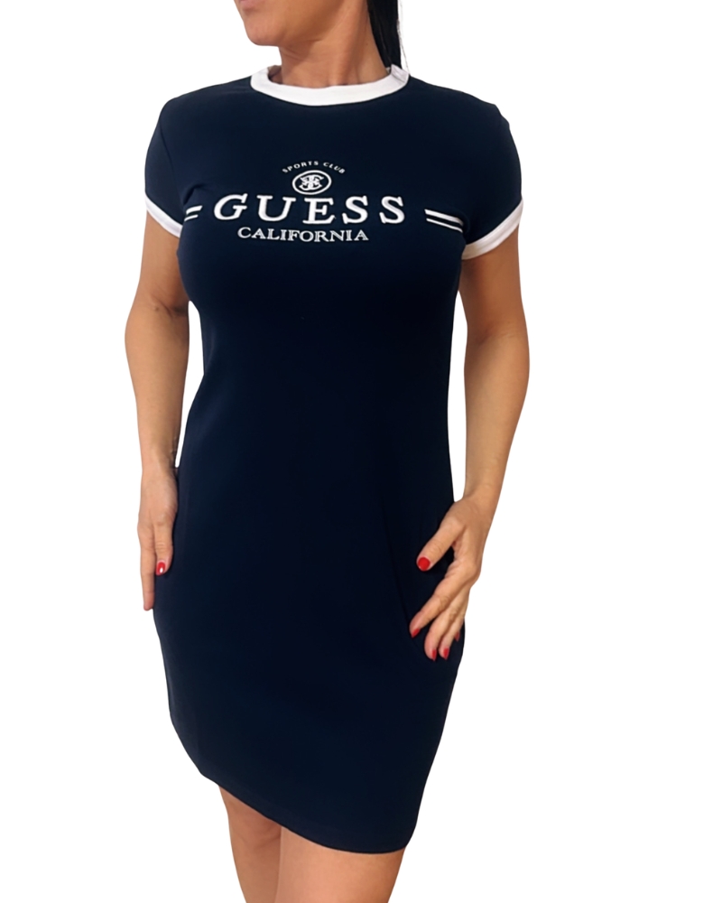 Dámské šaty v modré barvě mají uprostřed vyšitý nápis GUESS s jemným proužkem po bocích.
