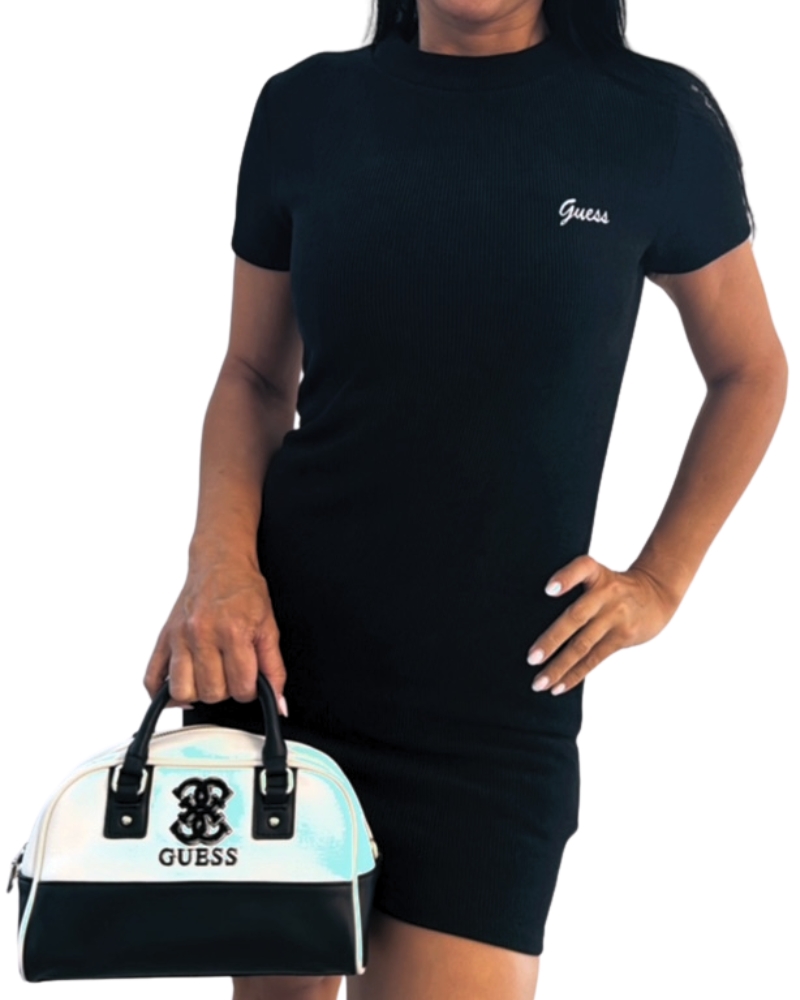 Dámské šaty jsou uplejšího slim střihu ke krku a krátké rukávy.