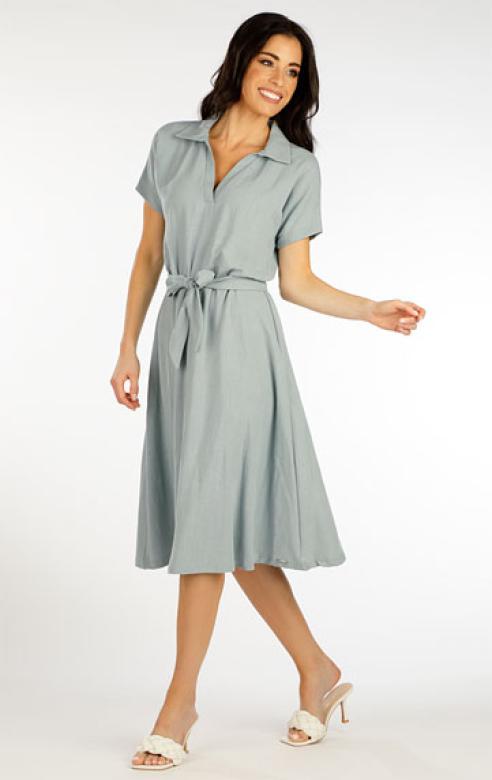 Elegantní šaty volného střihu s límečkem a ležérním výstřihem. V pase přestřižené s páskem na zavázání.