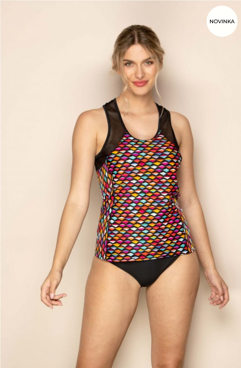 Elegantní sportovní tílko v kombinaci se síťkovanou látkou.