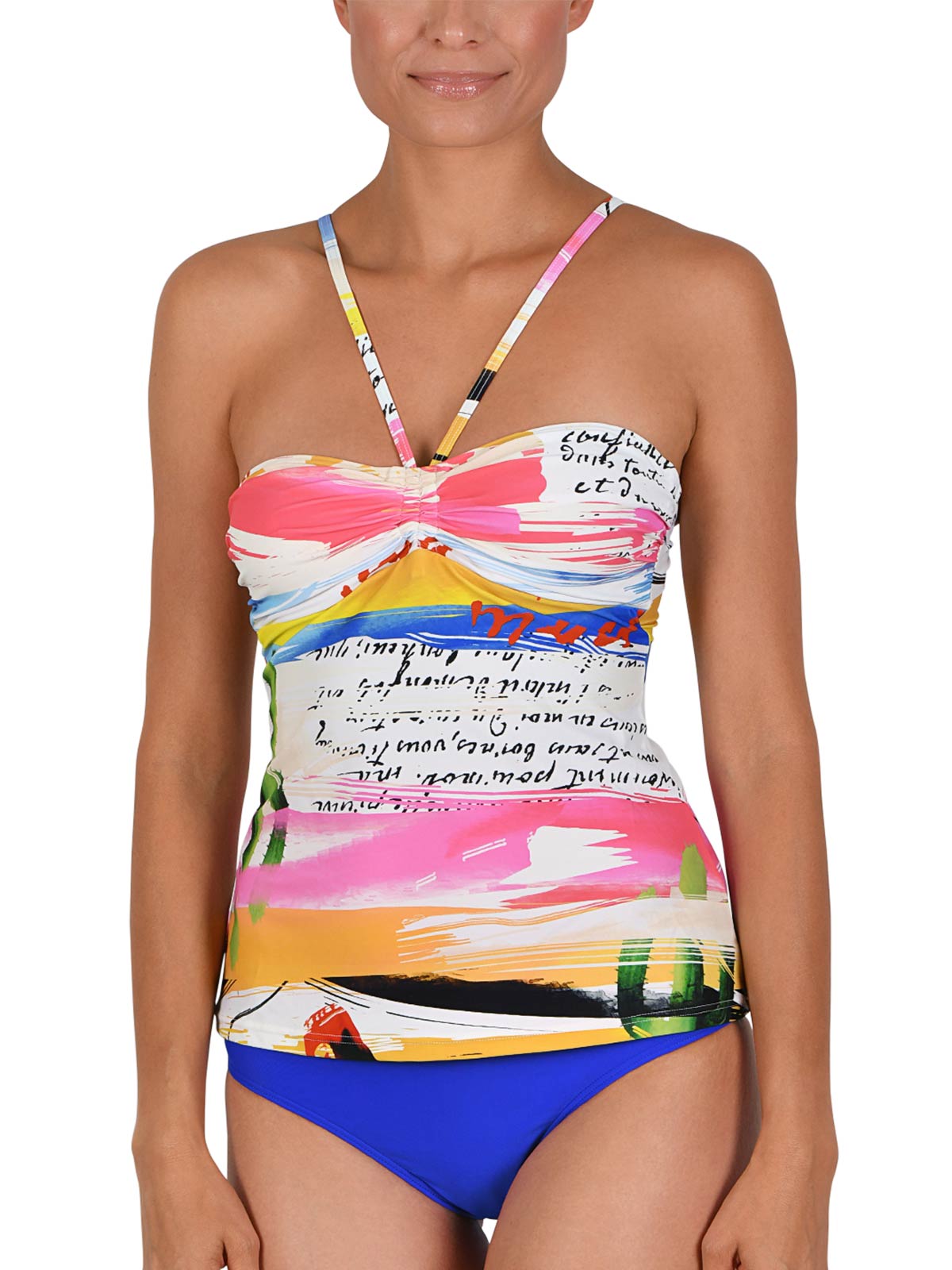 Dámské tankini – plavky jsou dvoudílné – vrchní díl top s podšitou podprsenkovou částí a kosticí pod prsy, aby tvarovaly dekolt. Po boku je rovněž kostice, aby plavky držely tvar.