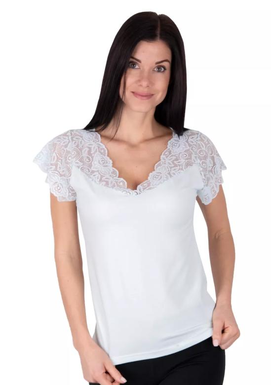 Dámské tričko 1030 mint RISVEGLIA je elegantní kousek, který zaujme svým véčkovým výstřihem a krátkým rukávem ozdobeným krajkou. Tento model kombinuje jednoduchost s jemným zdobením, což podtrhuje jeho styl bez vzoru.