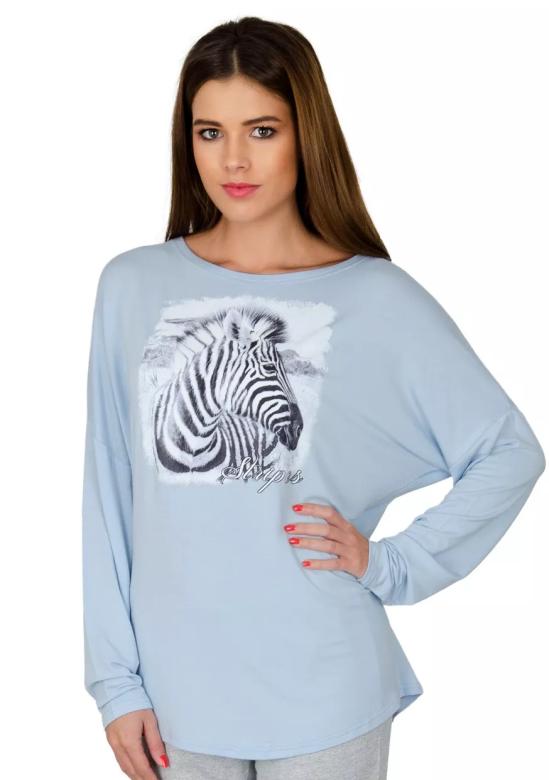 Objevte pohodlí a styl s dámským trikem 56/2-2/A2 modré FABIO, které zaujme svým jemným modrým odstínem a originálním potiskem zebry doplněným nápisem Stripes. Toto tričko s dlouhým rukávem je ideální volbou pro každodenní nošení, kdy oceníte jeho lehkost a příjemný materiál.