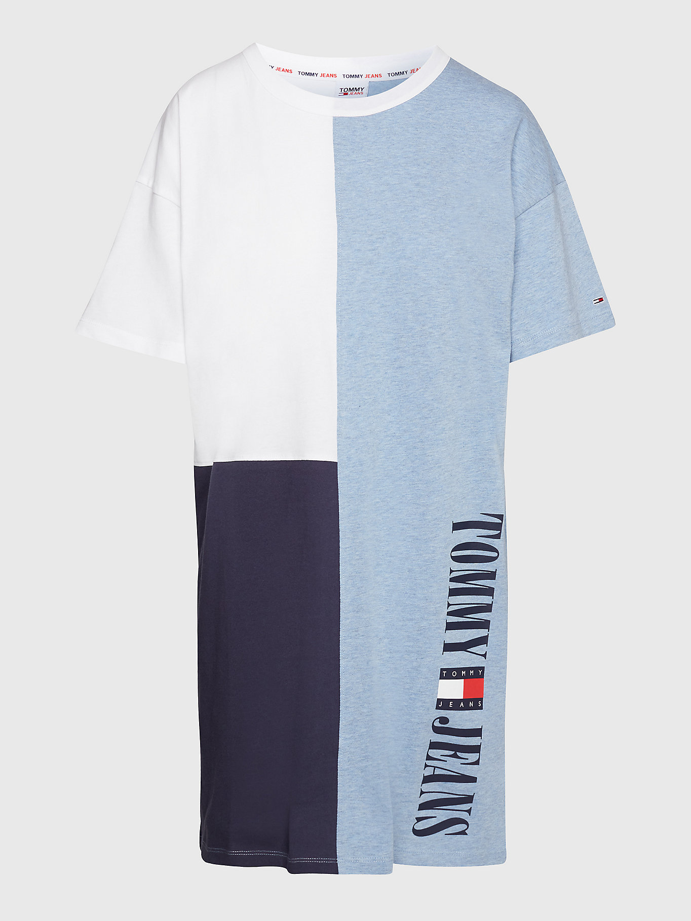 Dámské šaty mají kulatý výstřih a krátké rukávy. triko zdobí svislý nápis značky Tommy Hilfiger s logem.