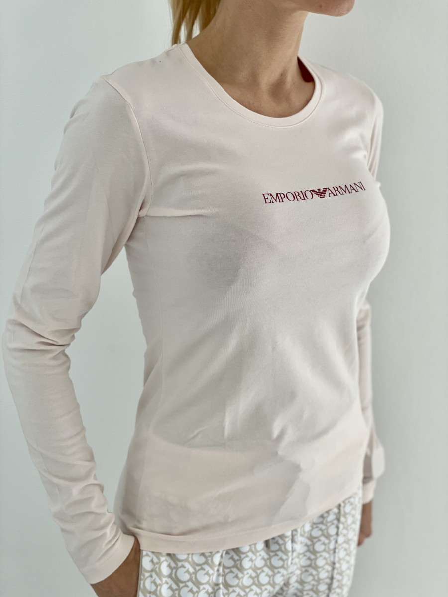 Dámské triko má dlouhé rukávy, je příjemné elastické v jemné pudrové barvě s vínovým nápisem značky Emporio Armani.