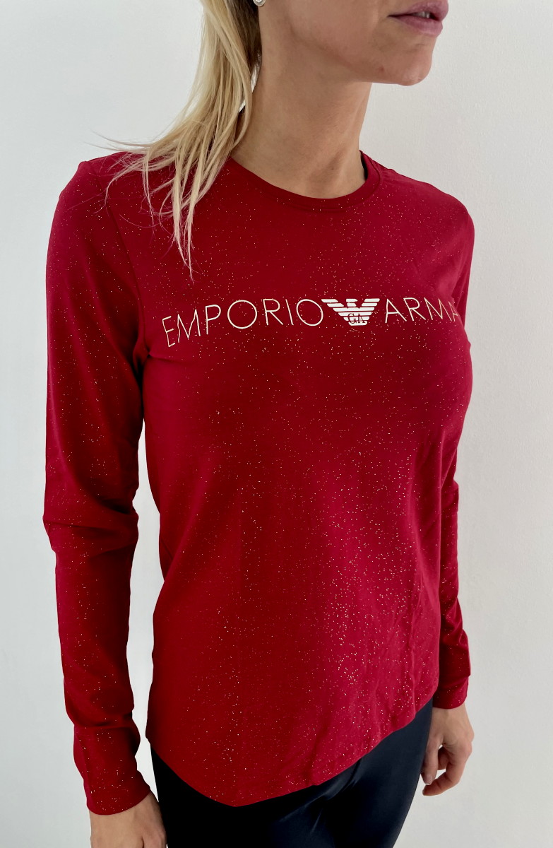 Dámské triko je s dlouhým rukávem v nádherné vínovo-červené barvě se zlatým odleskem. Triko má vpředu elegantní nápis ve zlaté barvě Emporio Armani.