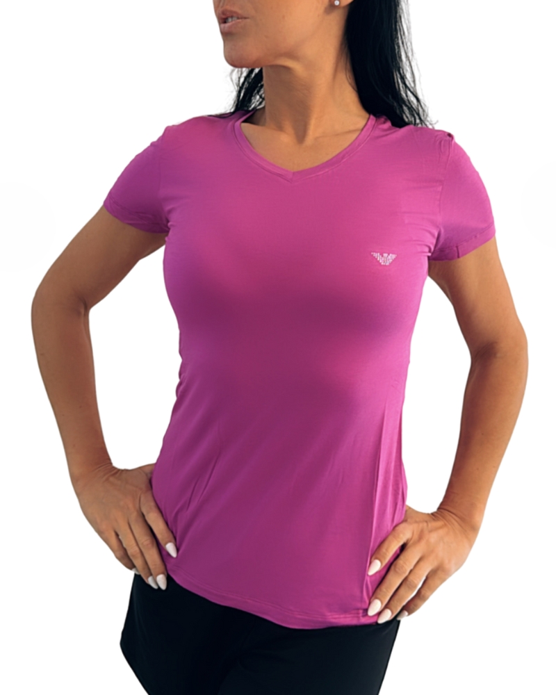 Triko má pěkný výstřih a efektní kamínkový znak Emporio Armani.