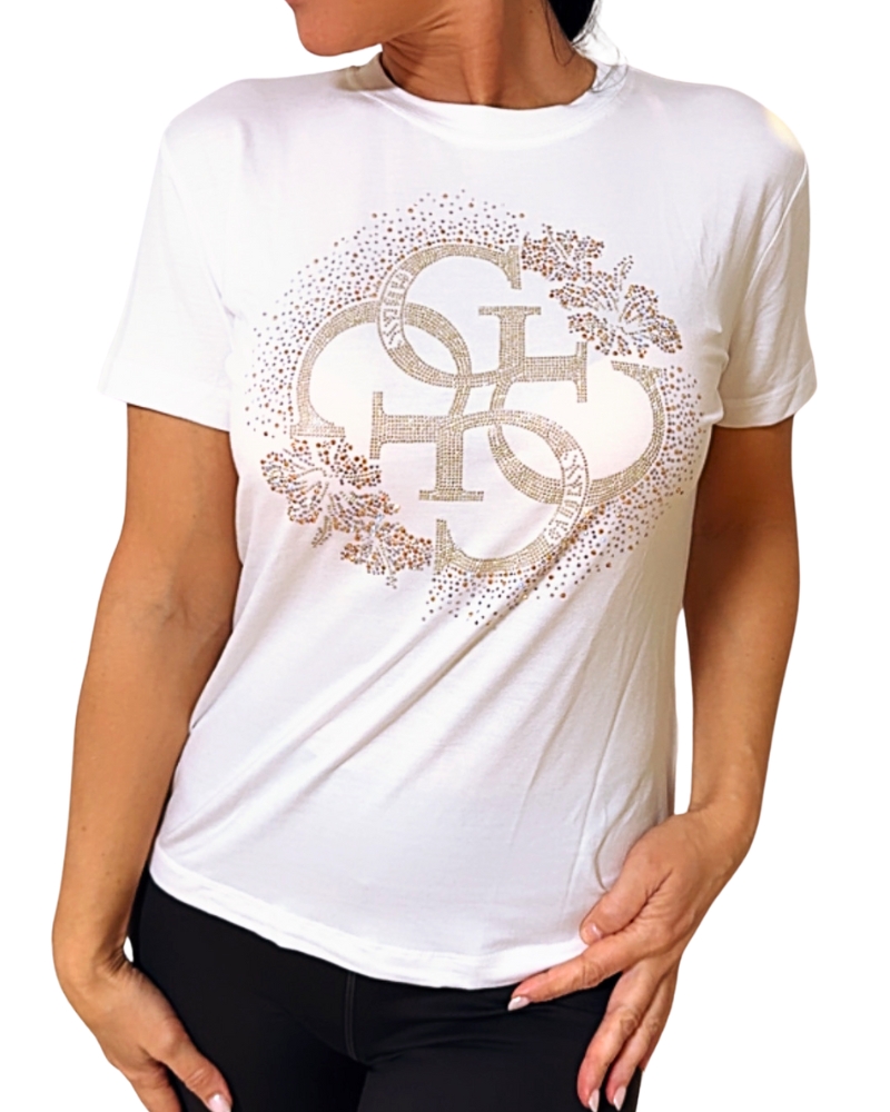 Dámské triko má vpředu nádherné kamínky s nápisem značky Guess.