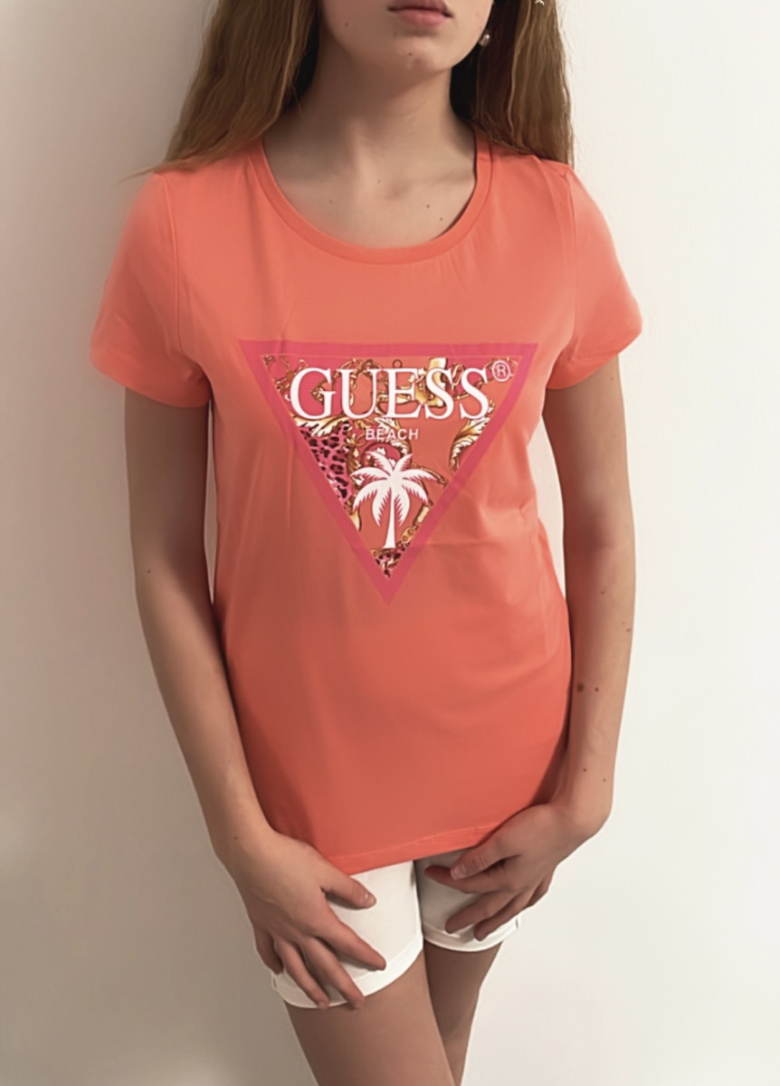Dámské triko je  v barvě růžové s kulatým výstřihem a vpředu má  trojúhelník se znakem značky Guess Beach s palmičkou.