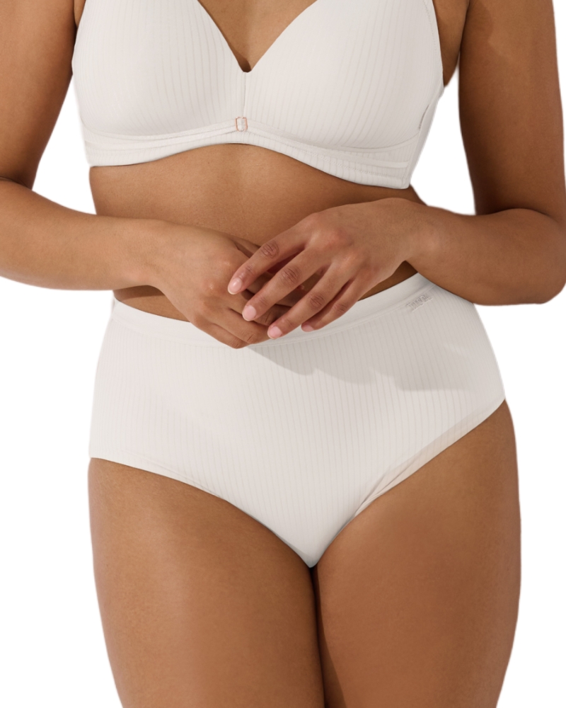 Kalhotky mají jemný páskovaný vzor, kalhotky sahají do pasu a schovávají větší část bříška.