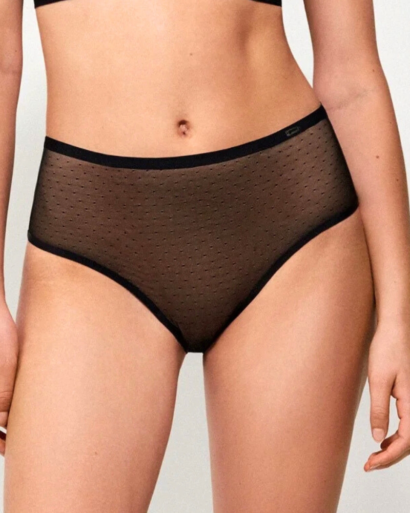 Kalhotky mají vnitřní část tělovou a vnější část je jemný elastický černý tyl s puntíčky.