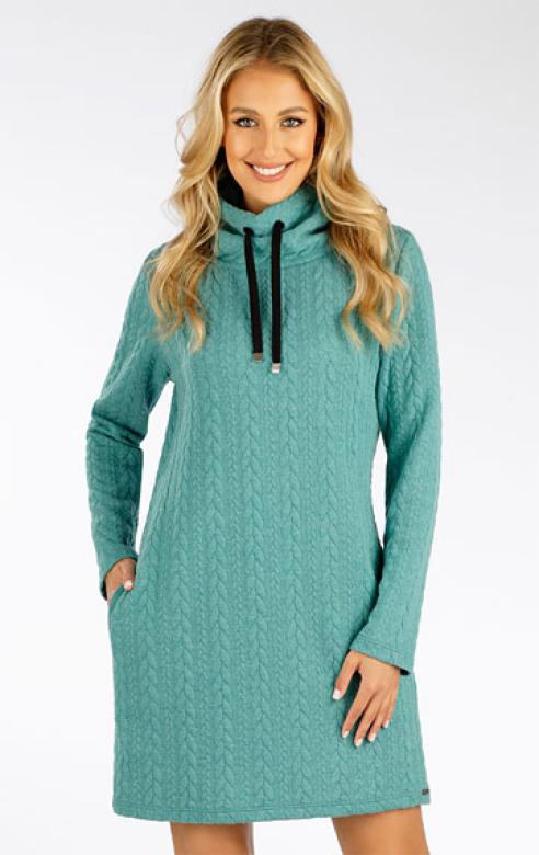 Dámské šaty s vyplétaným plastickým vzorem mají u krku vysoký stoják s průchodkami a tkanicí se stříbrnými koncovkami.