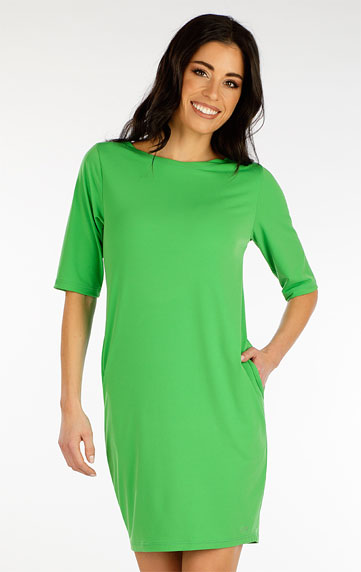dámské šaty volného střihu s kapsami a délkou nad kolena v módní zelené barvě.