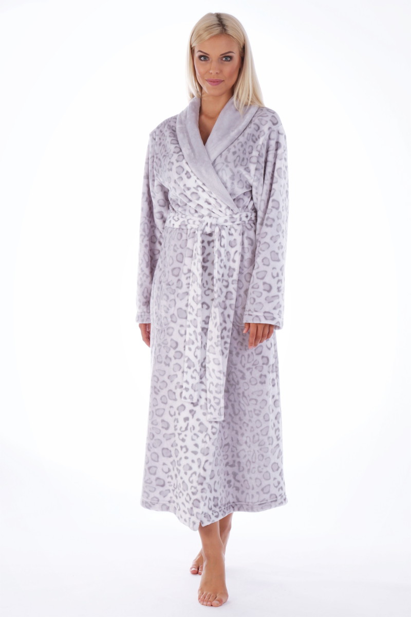 Dámský župan se nabízí ve světle šedém základu s leopardím límcem nebo obrácená varianta s šedým límcem na leopardím základu.