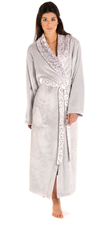 Dámský župan se nabízí ve světle šedém základu s leopardím límcem nebo obrácená varianta s šedým límcem na leopardím základu.