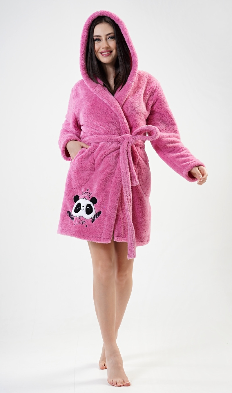 Na boku je  obrázek roztomilé pandy. Použitý materiál je jemný a poddajný na dotek. Župan je vhodný na denní nošení.