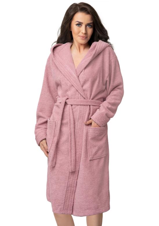 Dámský župan s kapucí od značky Dorota je vyrobený ze 100% bavlny a díky tomu je velmi příjemný na nošení. Kolem pasu je opasek na zavazování, který drží na přišitých poutkách. Župan má boční kapsy a délku po kolena. Materiálové složení: 100% bavlna