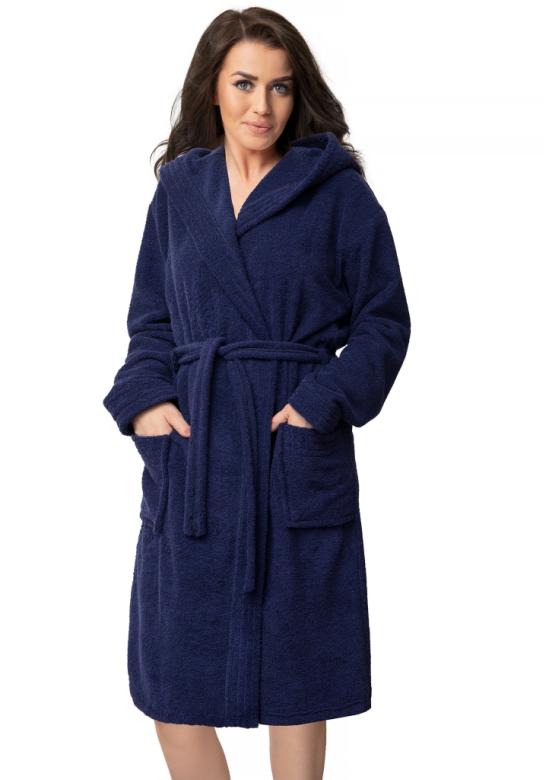 dámský župan s kapucí od značky Dorota je vyrobený ze 100% bavlny a díky tomu je velmi příjemný na nošení. Kolem pasu je opasek na zavazování, který drží na přišitých poutkách. Župan má boční kapsy a délku po kolena. Materiálové složení: 100% bavlna
