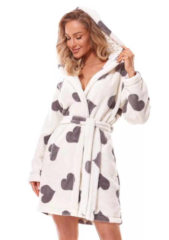 Dámský župan Futura white LandL je ideální volbou pro každou ženu, která hledá pohodlí a styl v jednom. Tento krátký župan se vzorem srdíček nabízí příjemný materiál Wellsoft, který zaručuje měkkost a tepelný komfort během chladných dnů.