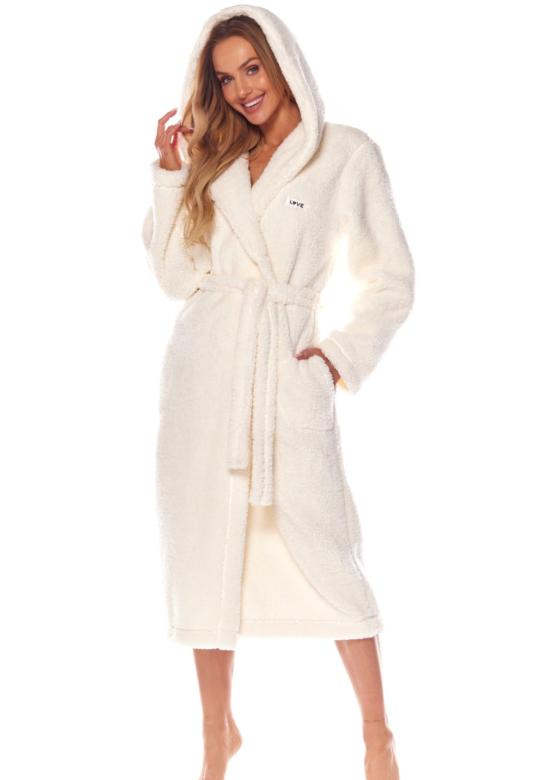 Dámský župan s kapucí značky LandL. Župan je dlouhý pod kolena. Na bocích jsou zapuštěné kapsy. Župan lze okolo pasu uvázat páskem. Župan je velmi příjemný na dotek. Materiálové složení: 100% polyester