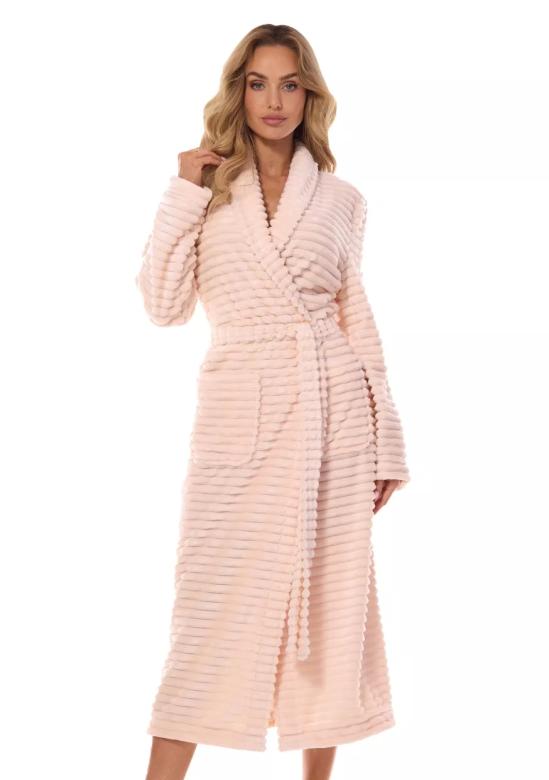 dámský župan Ritta morela značky LandL je ideální volbou pro chvíle odpočinku i domácí pohodu. Tento dlouhý župan v krásném meruňkovém odstínu zaujme svým jemným, žebrovaným vzorem a příjemnou měkkostí materiálu Wellsoft, který je zárukou tepla a komfortu. Svým praktickým zavinovacím střihem s páskem a velkými kapsami nabízí pohodlí při nošení a zároveň elegantní vzhled.