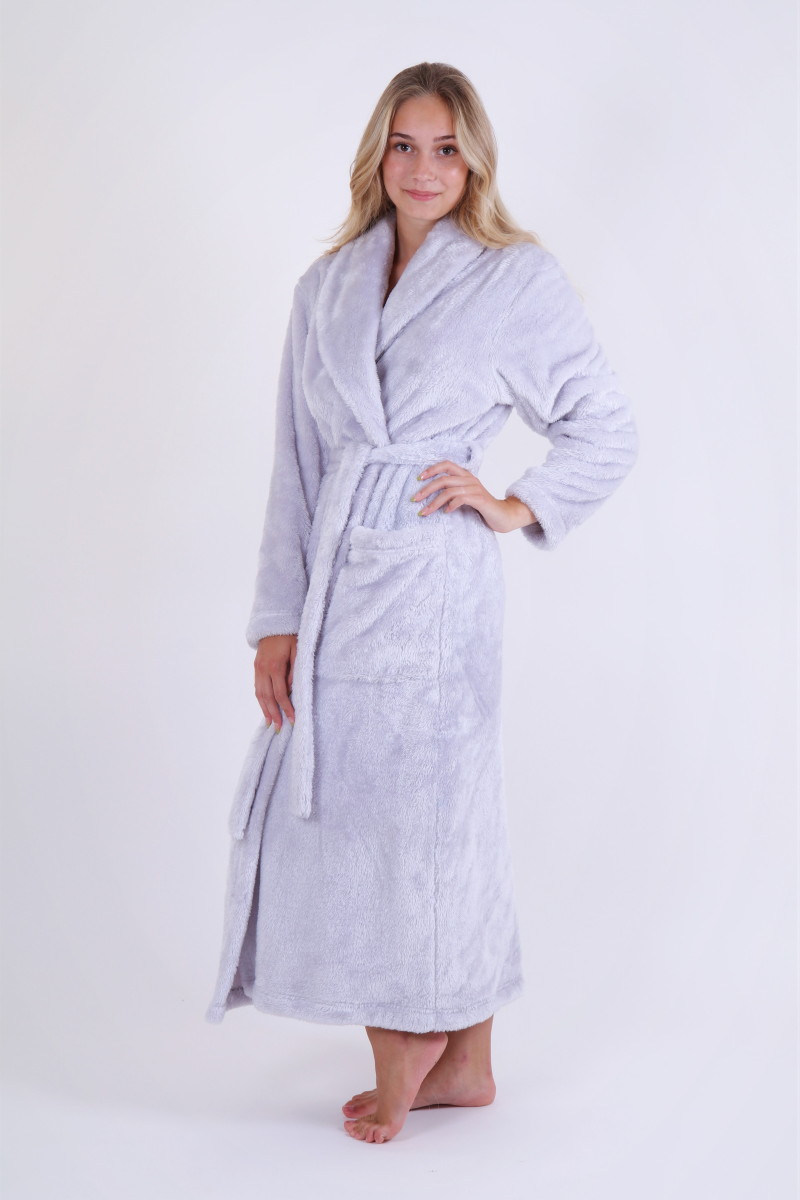 Pohodlný dámský župan se šálovým límcem má dvě kapsy a uprostřed pásek na zavazování.