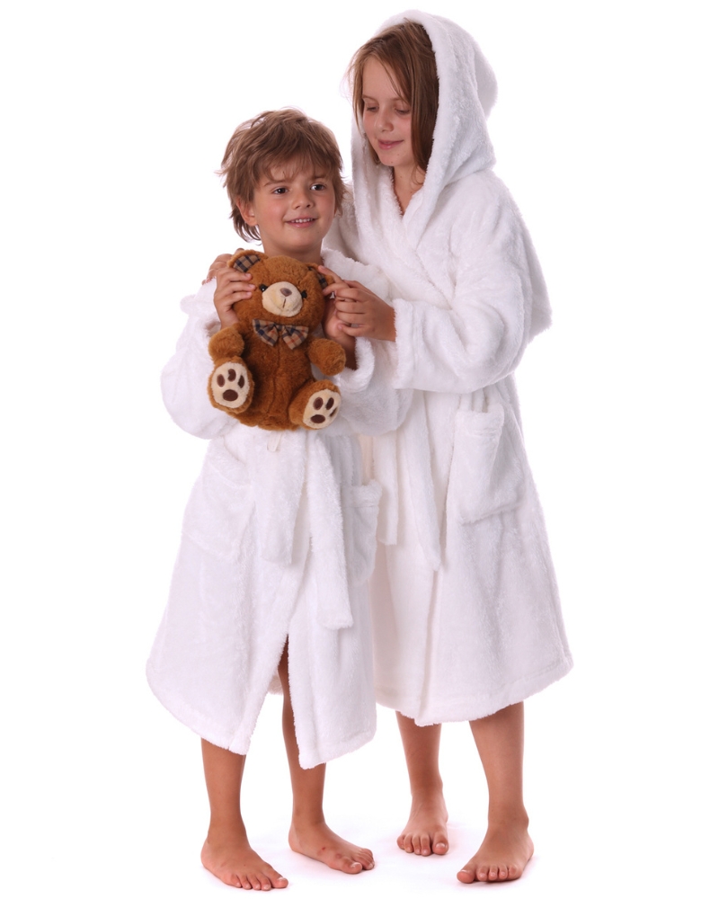 Dětský župan je dlouhý s kapucí.