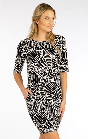 dámské šaty volného střihu s kapsami a délkou nad kolena.