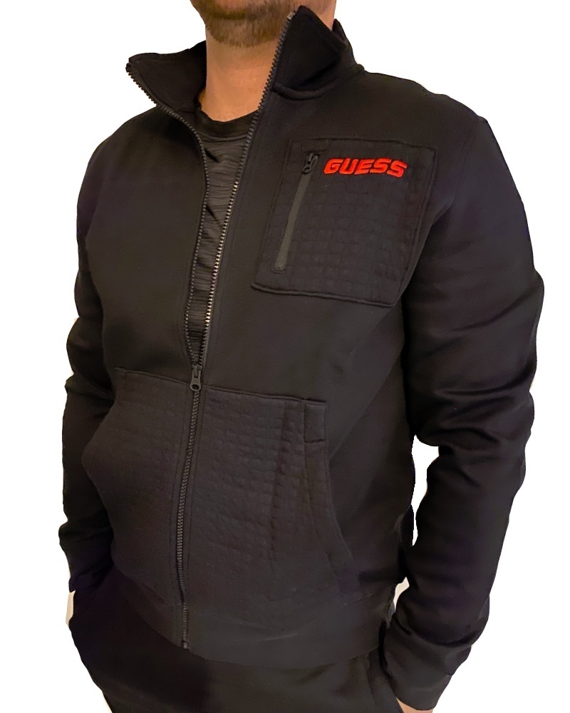 Pánská mikina je celorozepínácí s nižším stojáčkem, po bocích jsou všité kapsy. Mikinu zdobí malá kapsa na zip s červeným nápisem značky Guess.