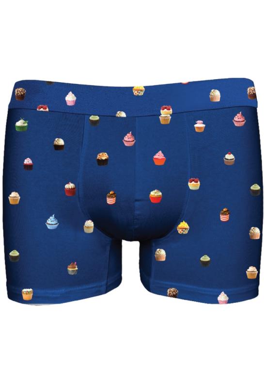 Pánské boxerky značky John Frank. Díky vysokému procentu mikromodalu jsou boxerky velmi příjemné na dotek a pohodlné při nošení. Boxerky jsou tmavě modré barvy se vzorem mini cupcakeů. V pase je širší pružná guma se stejným motivem.