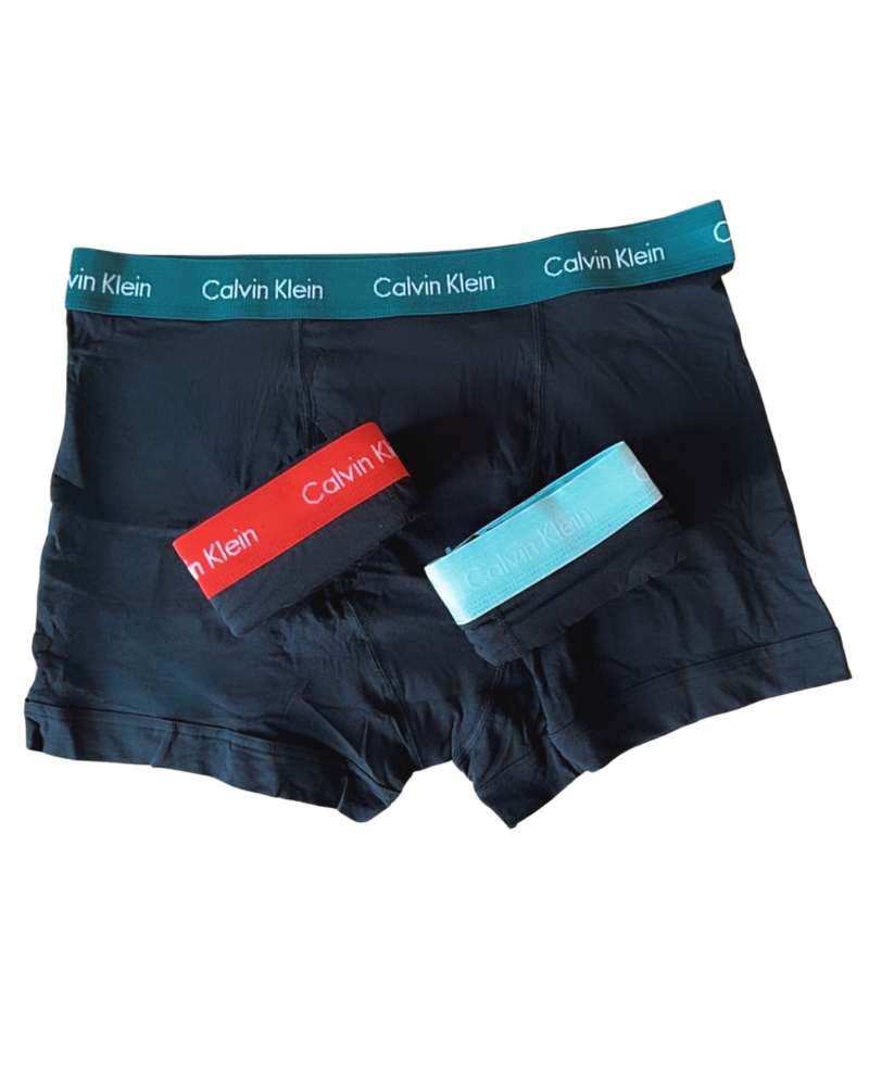 Pánské boxery jsou  v balení 3 kusů v černé barvě s módní gumou v barvě červené, modré a zelené a nápisy značky Calvin klein.