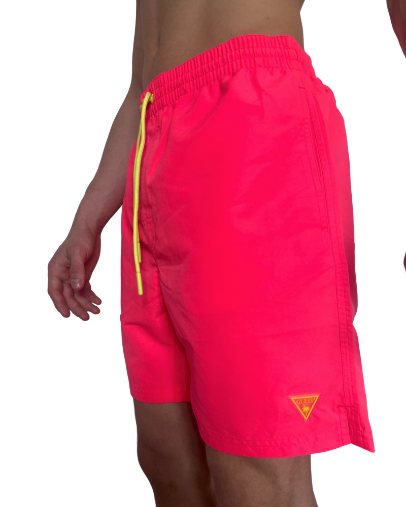 Úžasné svítivé pánské koupací šortky-plavky kolekce GUESS v neonové růžové barvě.