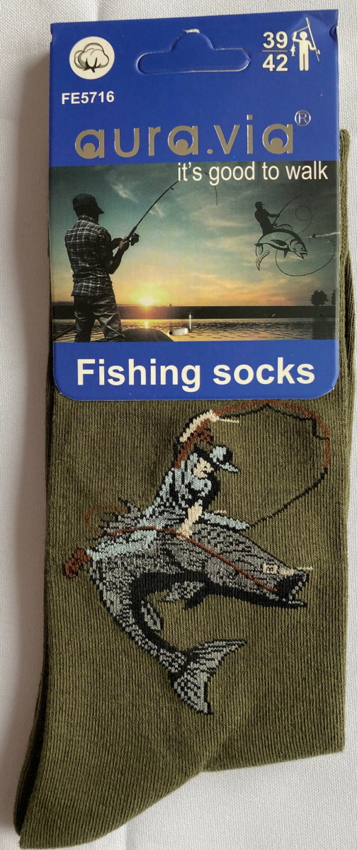 Pánské ponožky jsou v khaki zelené barvě s rybářskými motivy – viz ukázka ve fotogalerii.