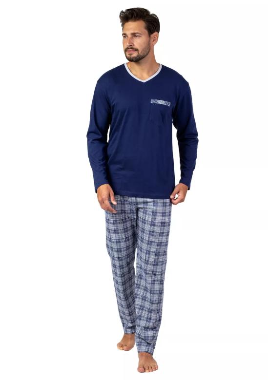 pánské pyžamo 471/41 REGINA nabízí komfort a styl v jednom. Tmavě modré triko s véčkovým výstřihem a dlouhými rukávy je doplněno o praktickou malou kapsu na prsou, která zdůrazňuje detaily oblečení. Kalhoty se vzorem jsou vyrobeny z jemného bavlněného úpletu, který je příjemný na dotek a zajišťuje pohodlí po celou noc. Široká guma v pase zaručuje dokonalé padnutí bez nepříjemného tlačení, zatímco dlouhé kalhoty bez kapes přispívají k elegantnímu vzhledu pyžama.