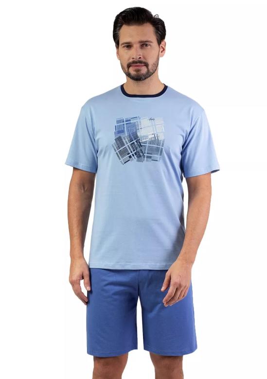 Zažijte pohodlí a styl s pánským pyžamem 474/51 REGINA, které nabízí ideální spojení kvalitního materiálu a moderního vzhledu. Vrchní díl v světlé modré barvě je ozdoben jemným geometrickým motivem, který dodává pyžamu jemný designový prvek. Kontrastní tmavší lem kolem kulatého výstřihu podtrhuje celkový elegantní dojem.