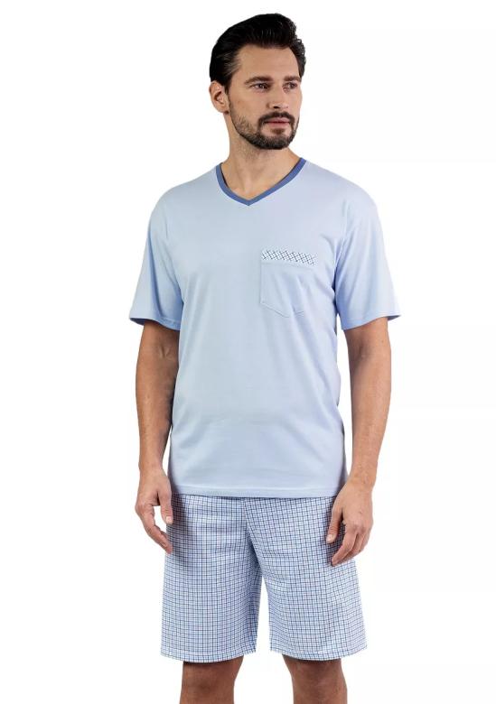 Pánské pyžamo 482/52 REGINA představuje ideální volbu pro pohodlný odpočinek i kvalitní spánek. Set obsahuje tričko s véčkovým výstřihem doplněné barevným lemem, který jemně podtrhuje jeho styl. Krátký rukáv