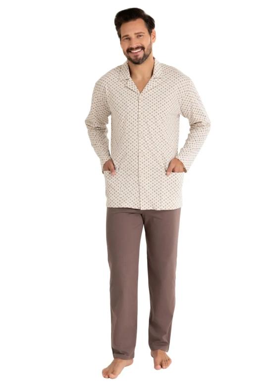 Pánské pyžamo 486/53 značky REGINA představuje spojení elegantního stylu a pohodlí, které ocení každý muž. Horní díl s decentním vzorem působí vkusně a nenápadně, zatímco jednobarevné hnědé kalhoty vytvářejí harmonický kontrast. Měkký materiál ze 100% bavlny zajišťuje maximální komfort během spánku i při domácím odpočinku. Pyžamo má volný střih pro pocit lehkosti, dlouhé rukávy a klasický límec s propínáním po celé délce. Praktické boční kapsy přidávají funkčnost bez kompromisů na vzhledu.