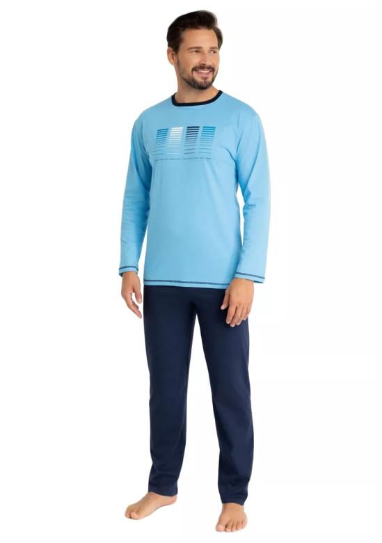 pánské pyžamo 487/51 značky REGINA představuje spojení elegance a pohodlí, které ocení každý muž hledající kvalitní noční prádlo. Svěží světle modrý vršek s originálním potiskem vodorovných linií v odstínech modré a bílé dodává moderní vzhled, zatímco kontrastní tmavě modré lemy u krku i na rukávech podtrhují jeho stylový charakter. Dlouhé rukávy poskytují příjemné teplo během chladnějších nocí. Kalhoty v klasické tmavě modré barvě mají volný střih a elastický pas pro maximální komfort při spánku i domác…